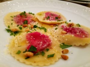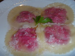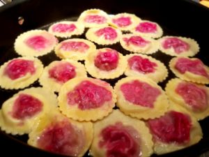 - Sprinkle 2 smooth kitchen towels with flour. Place 8 pasta rounds on work surface, keeping remaining dough covered with plastic. Place small bowl of water next to work surface. Spoon 1 teaspoon or so, (don’t overfill) beet filling onto half of each round. use pastry brush to dampen edge of 1 round. Fold dough over filling, pushing out as much air as possible and pressing edges firmly to seal. Transfer to prepared towels. Repeat with remaining rounds. (Can be prepared 1 week ahead. Transfer to rimmed baking sheet and place in freezer until frozen solid, about 6 hours. Transfer ravioli to resealable plastic bags.) Or store in layers on parchment paper in Tupperware containers so they don’t break in freezer.