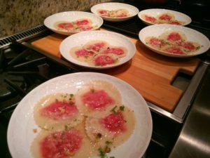 - If not using wonton wrappers, Roll Fresh Egg Pasta dough into sheets according to recipe. For wonton wrappers make sure you draw water around wraps so the top wrapper sticks and seals so your filling doesn’t come out when simmering in water. So, Place 1 dough sheet on work surface. Using 3-inch round biscuit cutter, (or use what size you are trying to achieve or you can rustic hand cut) Cut sheet into as many rounds, squares depending on what size cutter you are using. Transfer ravioli pieces to lightly floured baking sheet; cover with plastic wrap. Repeat with remaining dough for total of 52+ rounds or so.