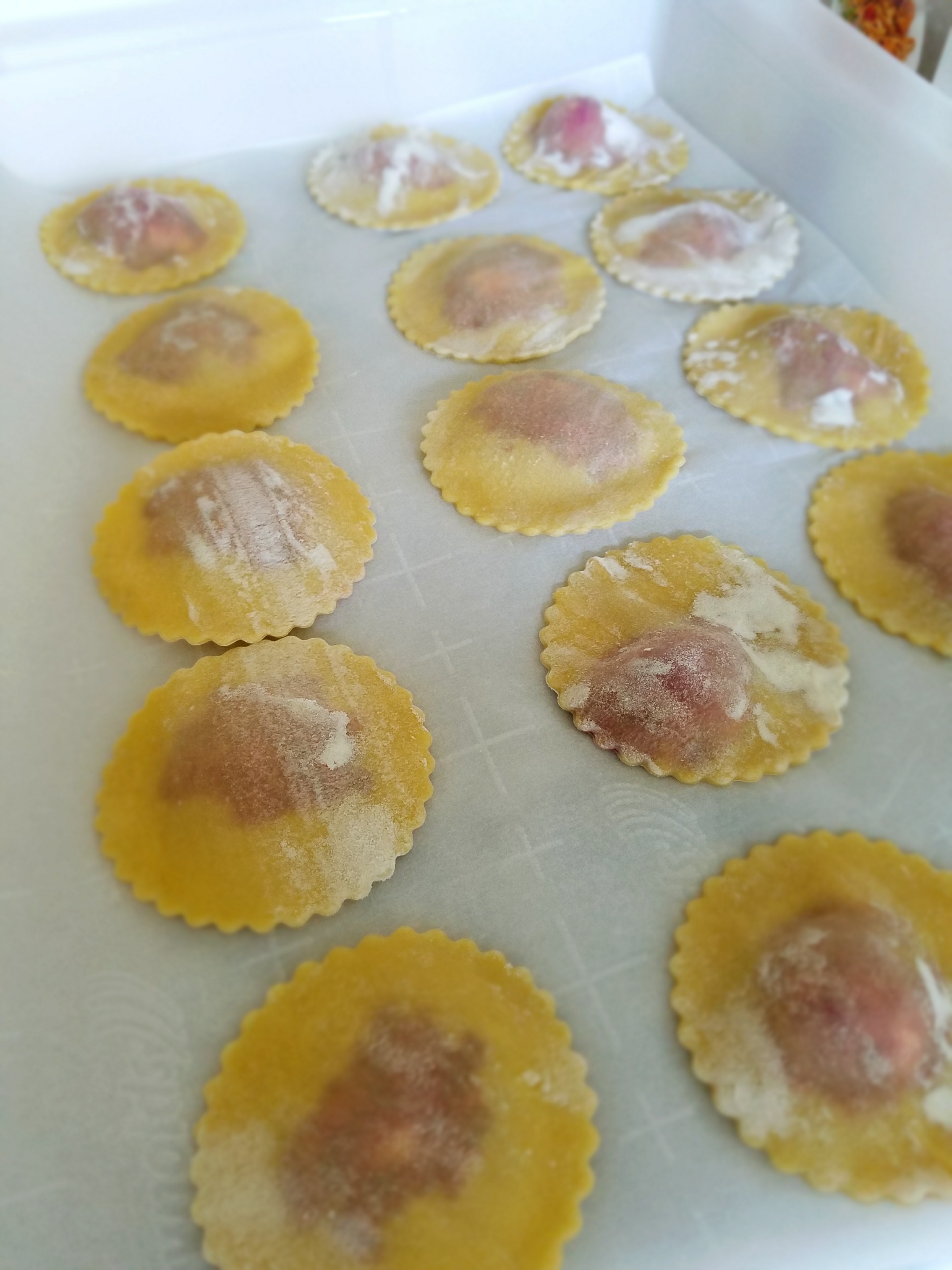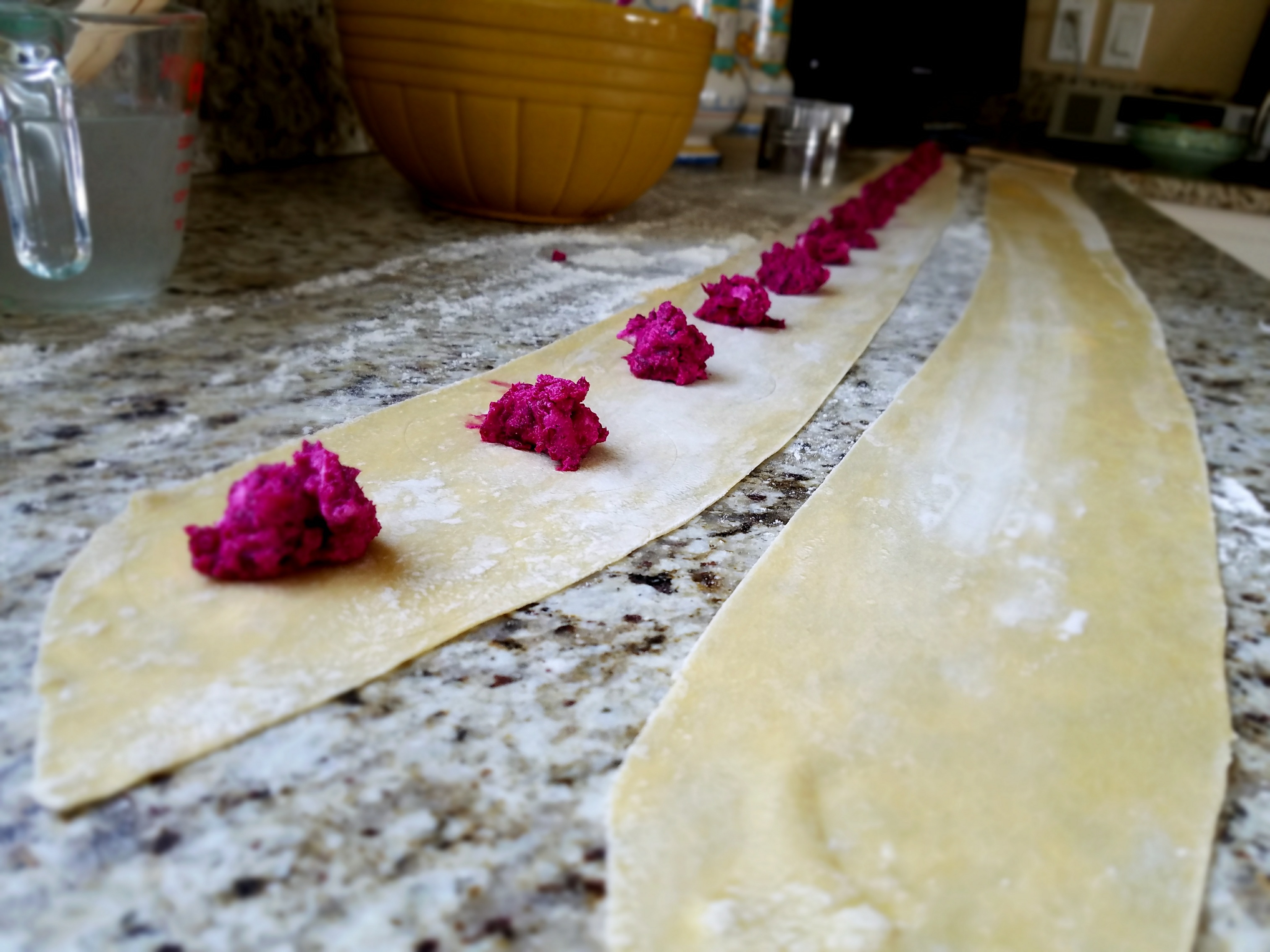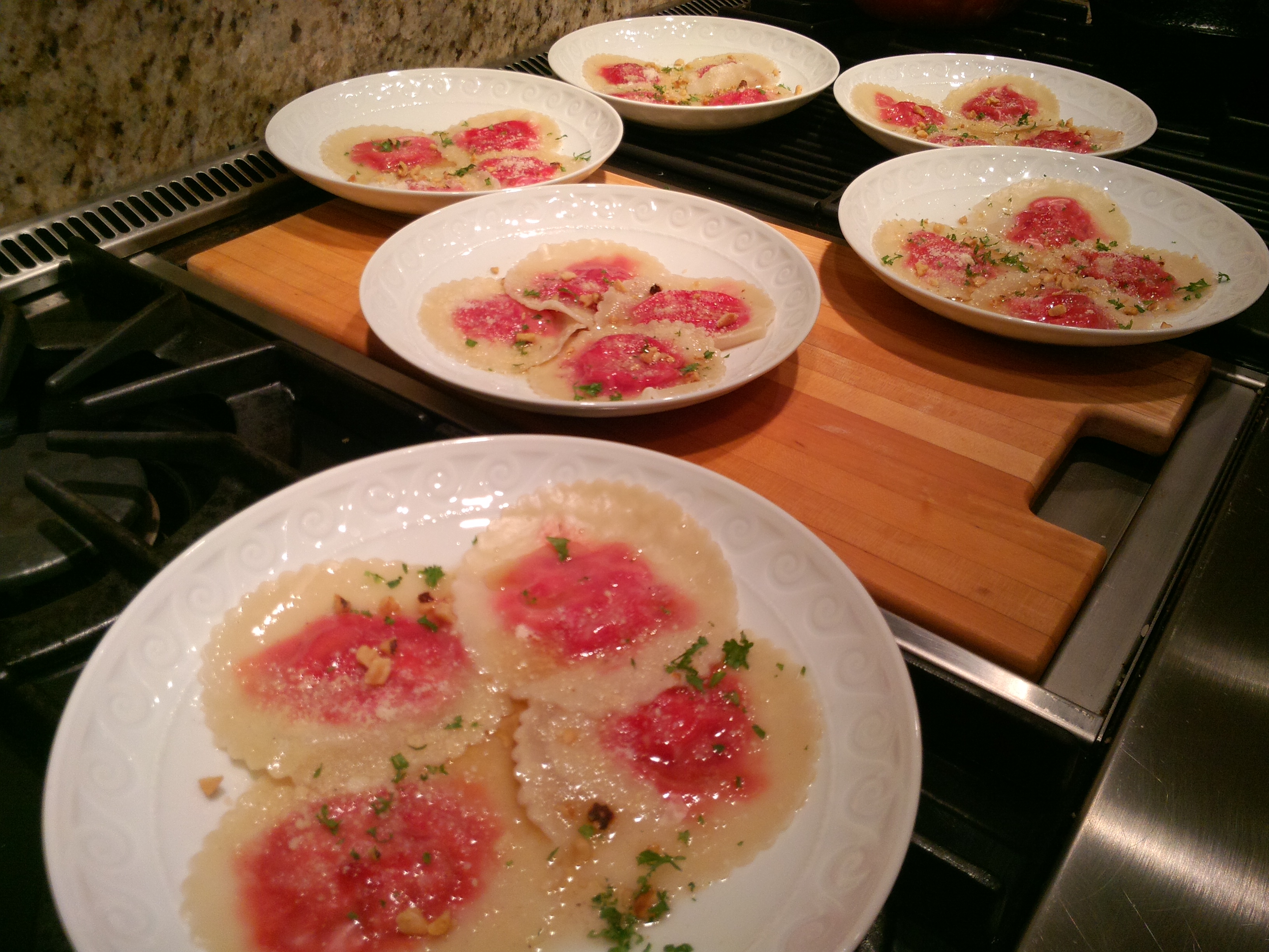 - Sprinkle 2 smooth kitchen towels with flour. Place 8 pasta rounds on work surface, keeping remaining dough covered with plastic. Place small bowl of water next to work surface. Spoon 1 teaspoon or so, (don’t overfill) beet filling onto half of each round. use pastry brush to dampen edge of 1 round. Fold dough over filling, pushing out as much air as possible and pressing edges firmly to seal. Transfer to prepared towels. Repeat with remaining rounds. (Can be prepared 1 week ahead. Transfer to rimmed baking sheet and place in freezer until frozen solid, about 6 hours. Transfer ravioli to resealable plastic bags.) Or store in layers on parchment paper in Tupperware containers so they don’t break in freezer.