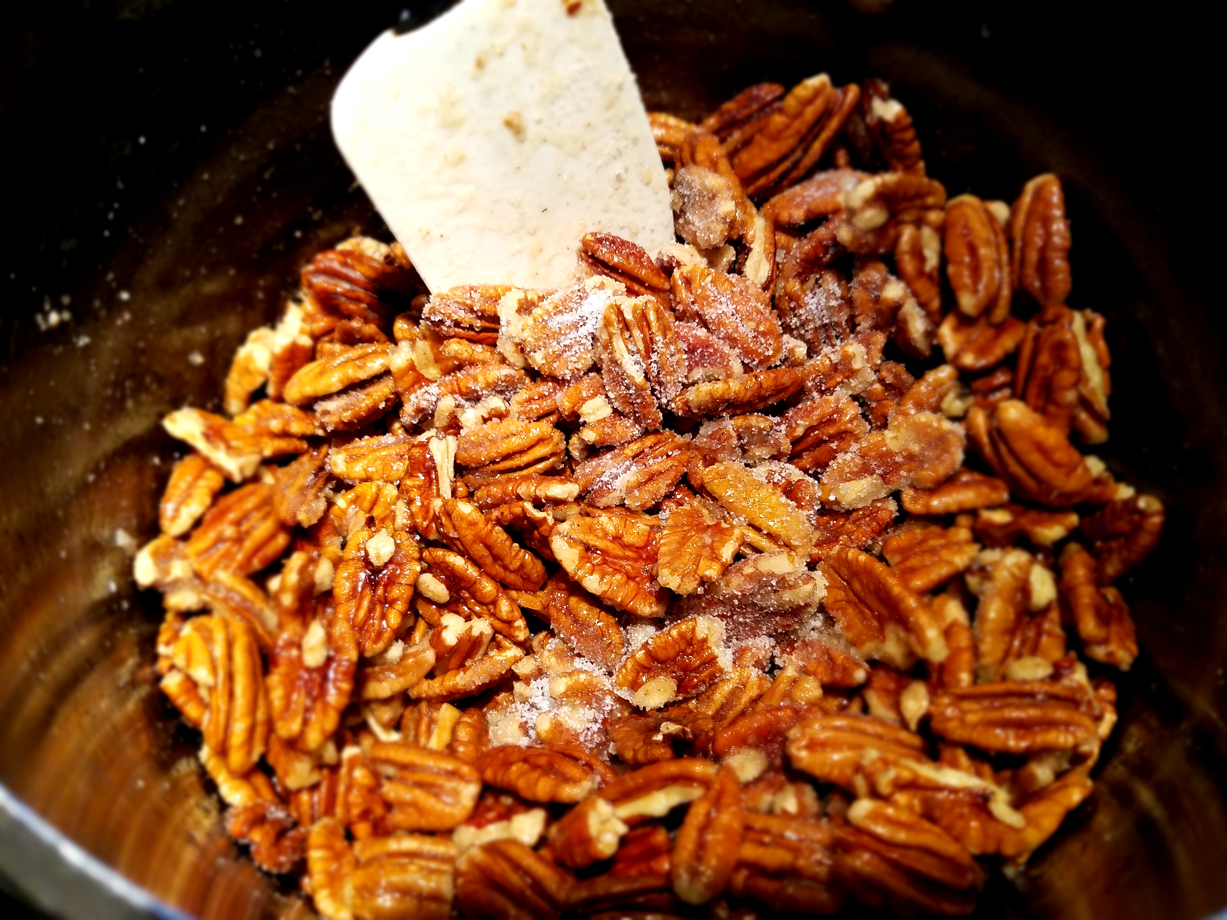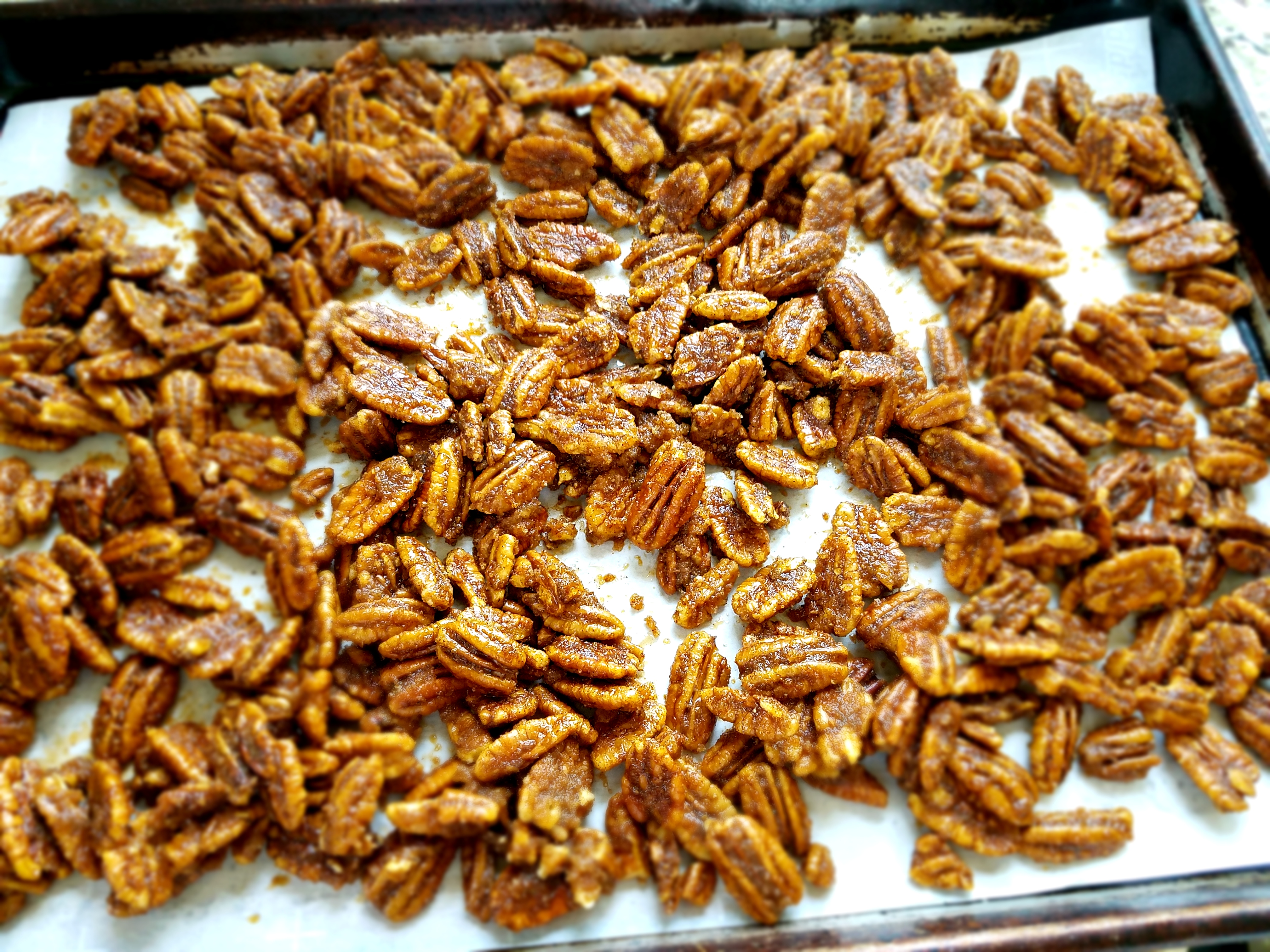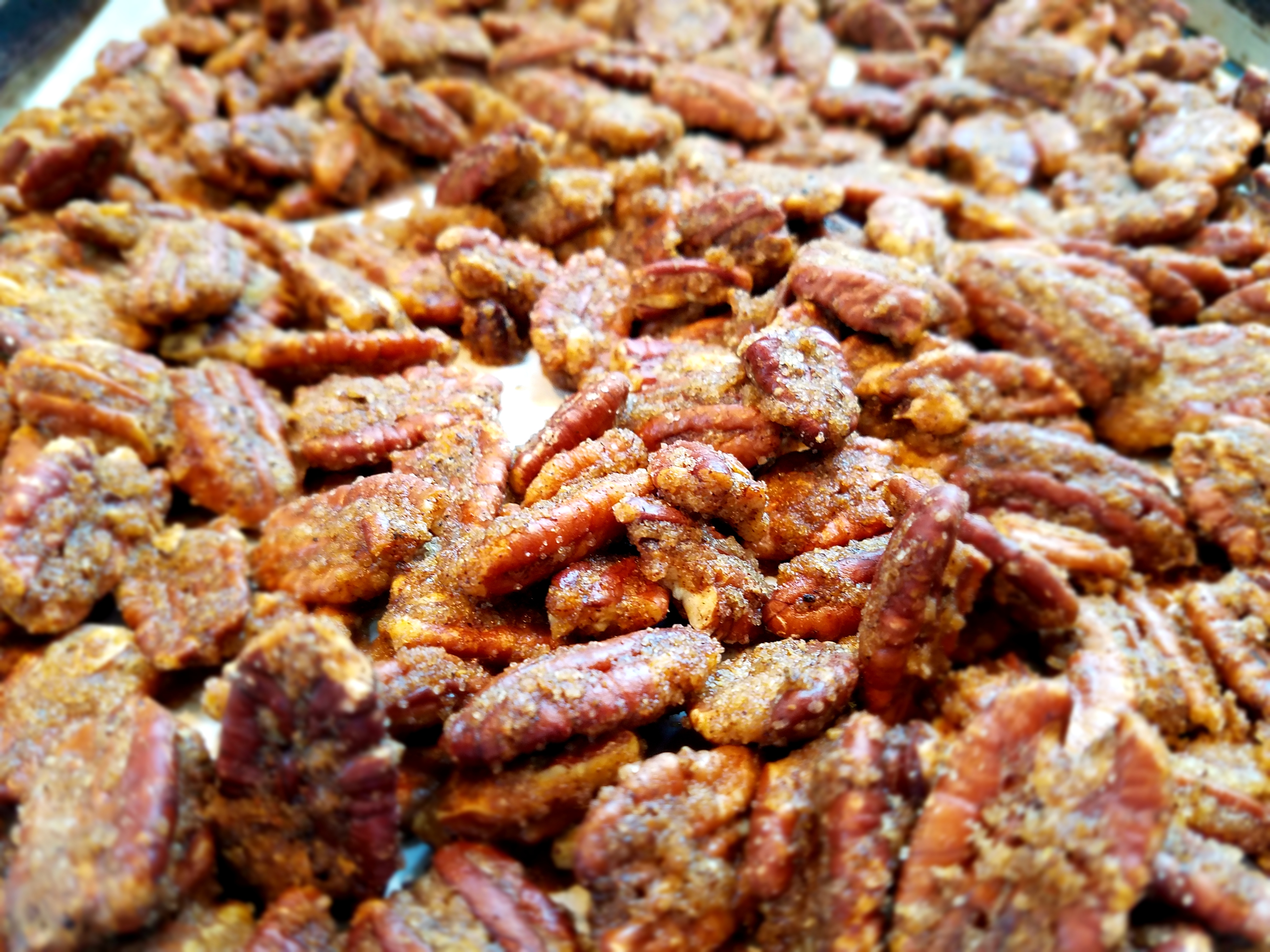 Preheat oven to 350 degrees. Heat the butter in a large sauté pan until foamy. Add the pecans and stir. Then add the sugar and stir to coat. Add the spice mix and thoroughly stir so that the nuts are mix well with the spices. Cook for about 5 minutes or until the butter has been absorbed and the pecans are well coated. Then pour nuts on a sheet pan lined with parchment. Bake them for about 15 minutes. Depending on how much sugar you use, you will get some brittle like pieces on the nuts and some leftover spiced sugar. Once they are cooked take out and cool. When cool enough to touch, fluff up or loosen the pecans with your hands on the tray and cool some more. This will make more than you probably need so store the remaining pecans in a Tupperware container and into freezer, minus the ones you have already eaten. These pecans are so addicting!