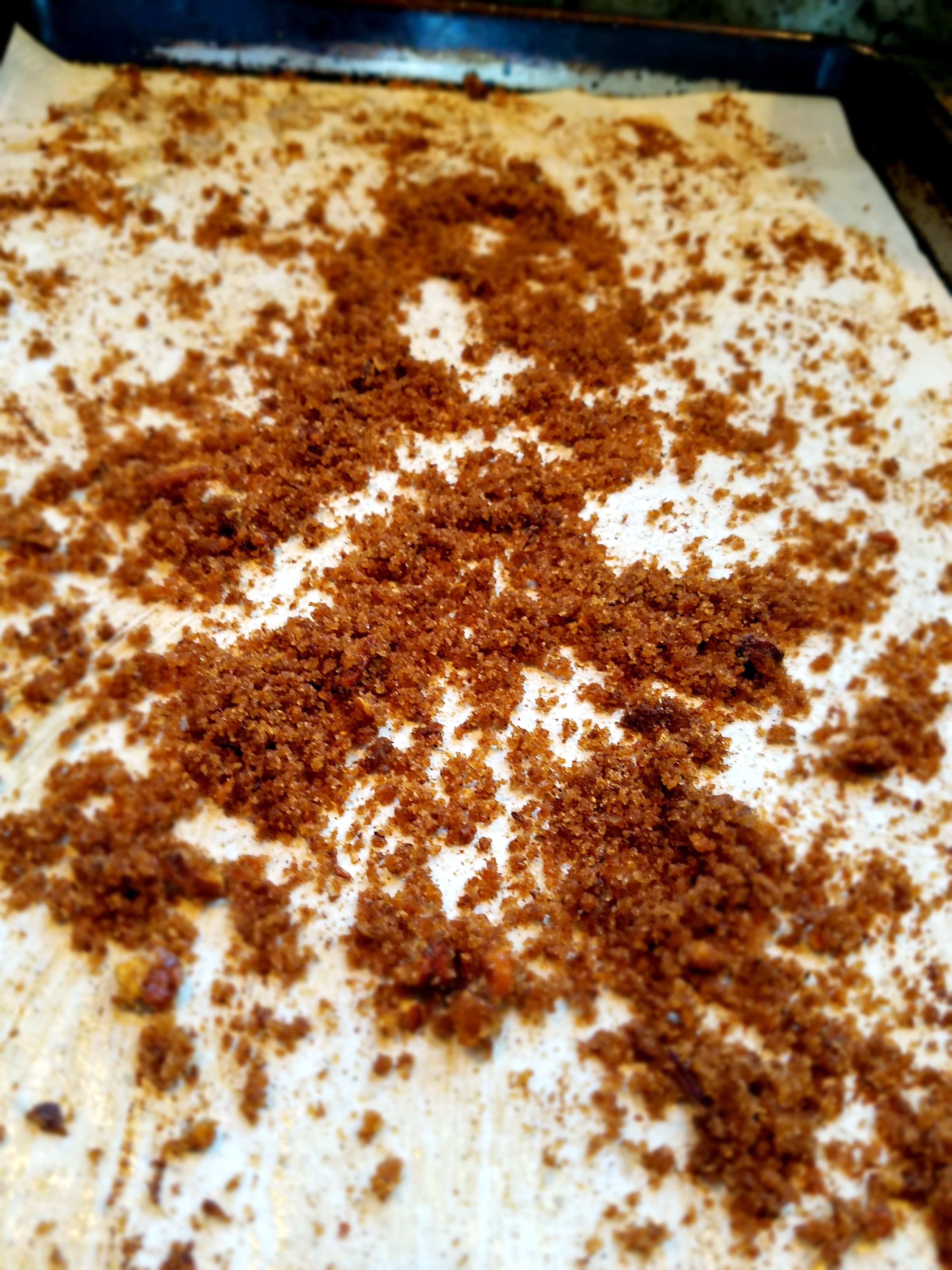 These are handy to keep in the freezer. They are perfect upon a salad, ice cream or just a snack. They don’t need to be thawed, you can just take out the the freezer when ready to eat and have at it. You need a half sheet pan and some parchment paper to make them.